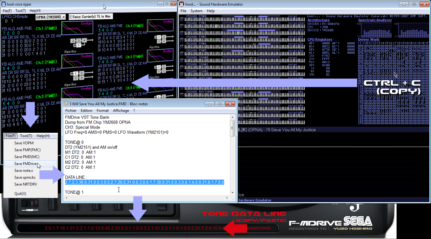 your favorite game and watch the FM registers moving (great for learning) and also extract any