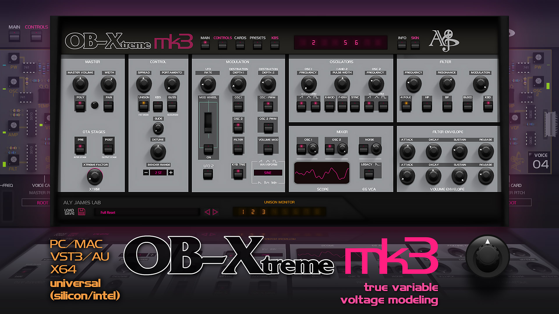 The Xtreme factor is the main control over the emulated OTA enduced distortion, one chip in particular the CA3080 was used a lot at different places in the circuit (although less and less over the OB synths evolution). OB-Xtreme gives some control over that, you can push them way beyond the original specs or stay at minimum for more traditional behavior, you can also bypass PRE or POST circuits for versatility.