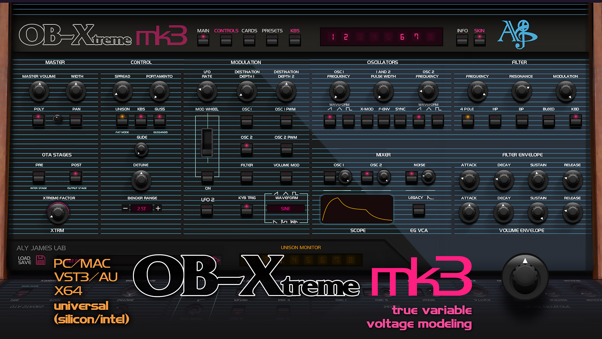 A complete list of OB-XTreme 2.0 features is provided below, in a nutshell OB-Xtreme can act as an 8 voice polyphonic, 8 voice unison mono or true (one voice) mono, a FAT mode engages the unison while also providing polyphonic unison, that means 8x8 voices power.