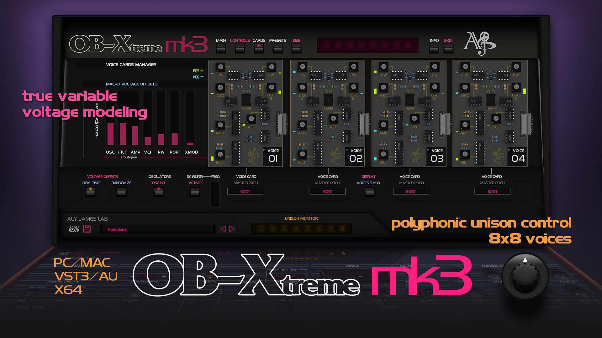 Another feature is the under the hood access so you can control the 8 voice cards voltages across the main parts. The cards variations are an important factor to mimic the analog character, while using a VCM (virtual component modeling) approach, I wanted something effective but not time consumming so I designed some pre-defined offsets and deviations that you can dial in or scatter across all 8 voices.